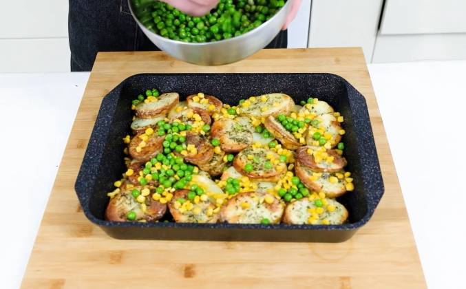 Как вкусно запечь картошку в духовке с горошком рецепт - вкусное и простое блюдо - картофель запеченный с горохом и кукурузой.