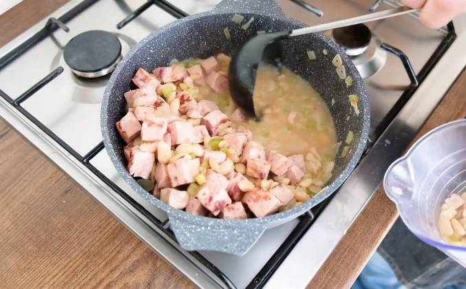2. Эта часть отлично подойдет для того чтобы готовить бульон. К ветчине добавляем сливочное масло и овощи. Все перемешиваем и готовим до размягчения овощей. Добавляем воду и фасоль. Перемешиваем, доводим до закипания, убавляем огонь. Готовим 10 минут. Суп практически готов, выключаем и оставляем остыть на 10 минут.