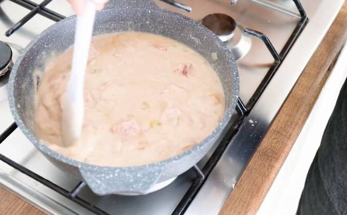 3. Суп остыл, перекладываем ветчину в сторону. И половину супа будем пюрировать. Возвращаем все в кастрюлю, перемешиваем. Накладываем суп. Финальным штрихом будет добавление гренок. Я использую готовые, но их также можно приготовить. Берете пшеничный хлеб, нарезаете его необходимой формы и обжариваете на сковородке с добавлением специй. Наше блюдо готово.Видео рецепт ютуб ниже 👇