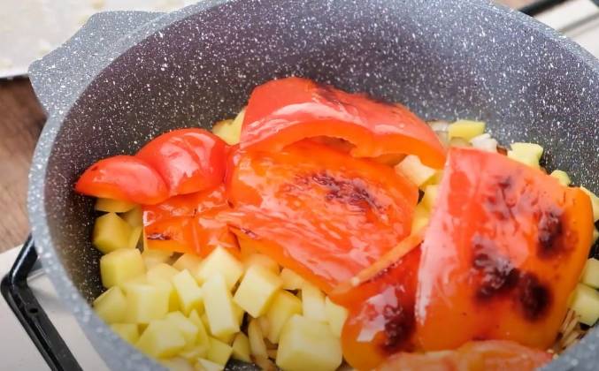 2. Лук с чесноком слегка поджарились, размягчились, теперь добавляем картофель. Готовим вместе 3-5 минут. Добавляем воды, доводим до закипания. Закроем крышкой, убавляем огонь до минимума и готовим до тех пор пока картофель не размягчится. Подготовим сальсу. Нарежем репчатый лук. Разогреем сковороду, добавим сливочное масло. Растопим его до состояния коричневого цвета. Масло поменяло цвет, теперь добавляем перец. Перец добавляйте по вкусу. Далее зеленый лук. Обжарим при постоянном помешивании. Теперь добавляем кукурузу, перемешиваем. Сальса готова, соль и перец по вкусу. Выключаем огонь. Сальса готова, накроем крышкой.