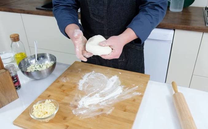 2. Теперь сделаем тесто, для этого мы берем муку. Добавляем в него разрыхлитель, немного солим, добавляем семена фенхеля и стакан йогурта. Тщательно перемешиваем до однородной консистенции. Должно получиться мягкое пушистое тесто. Должно получиться вот такое тесто. Помните что мука может быть очень разной. Стремитесь получить именно такую консистенцию. Теперь раскатываем тесто по форме нашего противня.