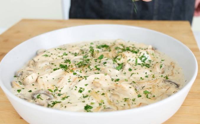 3. Тушим 2-3 минуты. Смешиваем в сливках одну большую столовую ложку муки. Теперь вливаем сливки с мукой, включаем сильный огонь и доводим до загустения. Выключаем и перекладываем в тарелку. Добавим свежую зелень. Наше блюдо готово.Видео рецепт ютуб ниже 👇