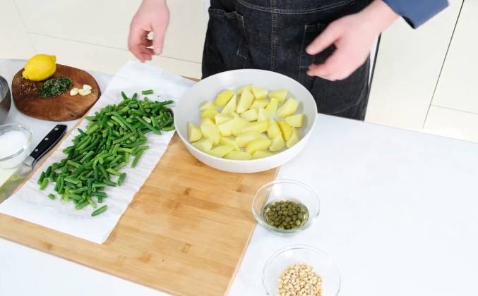 2. Картофель готов, теперь необходимо слить воду и промыть его. Просушим в бумажном полотенце. Начнем собирать наше блюдо. Аккуратно перекладываем картофель. Необходимо распределить равномерно по всей поверхности. Далее кладём фасоль. Теперь заправка. Мы наливаем оливковое масло. Небольшое количество соли. Хлопья перца чили по вкусу. Измельченные свежие зелень петрушки. Снимаем цедру лимона. Выжимаем сок лимона, нарезаем цедру.