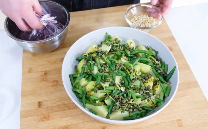 3. Перемешиваем заправку, добавляем каперсы. Вместо них можно использовать оливки или маслины. Они имеют приятный солоноватый вкус. Теперь необходимо заправить этим соусом наш картофель с фасолью. Последние штрихи - наш вымоченный лук также равномерно распределяем по всей поверхности. И кедровый орех. Вместо кедрового ореха можно использовать орех кешью. Но кешью предварительно необходимо измельчить. Блюдо готово друзья. Это блюдо можно подавать как в горячем так и в холодном виде.Видео рецепт ютуб ниже 👇