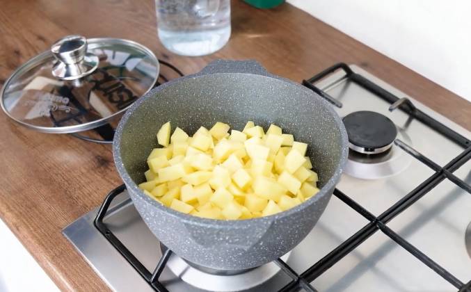 2. Обжариваем до образования легкой золотистой корочки. Тем временем, пока наш картофель обжаривается, мы нарежем чеснок и цуккини. Картофель уже слегка подрумянился, теперь необходимо добавить цукини, чеснок и кукурузу. Также все перемешиваем. Друзья, помните, для того чтобы ваша посуда прослужила вам дольше, лучше всего использовать пластиковые, силиконовые или деревянный предметы. Добавим специи, зира. Сразу же добавляем соль по вкусу, все перемешиваем.