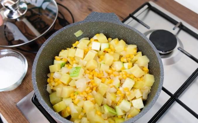 Как приготовить овощной суп с кукурузой и цуккини рецепт - очень вкусный и полезный овощной суп. В качестве ингредиентов мы будем использовать картофель, цукини, репчатый лук, чеснок, свежемороженая кукуруза, немного свежего базилика ну и специи. Для приготовления нашего блюда нам потребуется кастрюля объёмом 3 литра.