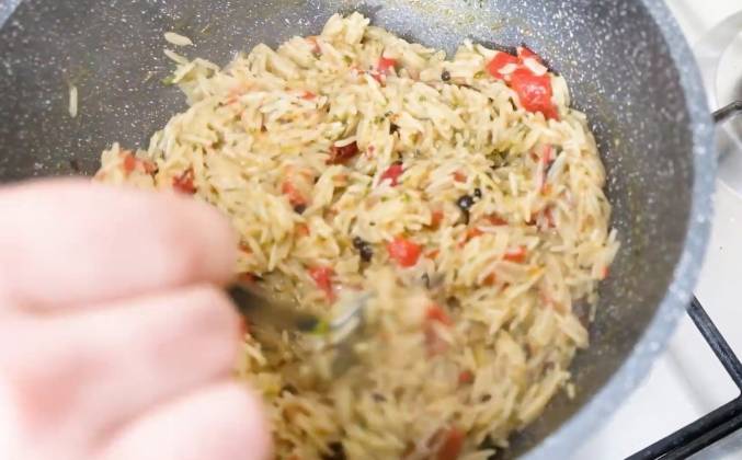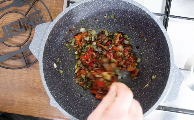 2. Убираем семена. Нарезаем. Засыпаем рис и заливаем водой, примерно 3 стакана. Теперь варим наше блюдо, пока рис не впитает всю влагу. Маш сварился, необходимо промыть большим количеством воды. Очень важно периодически перемешивать рис, для того чтобы он не пригорел. Необходимо постараться испарить эту влагу на слабом огне. Периодически помешиваем и выпариваем максимальное количество влаги.