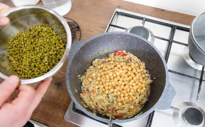 Как приготовить плов с нутом рецепт - блюдо под названием азиатский рис с бобовыми. Для приготовления самого блюда нам потребуется казан и сотейник Основа - длиннозерный рис, дальше добавим маш, нут, запеченный перец, специи. Само блюдо готовится не очень долго поэтому будем некоторые вещи делать параллельно.