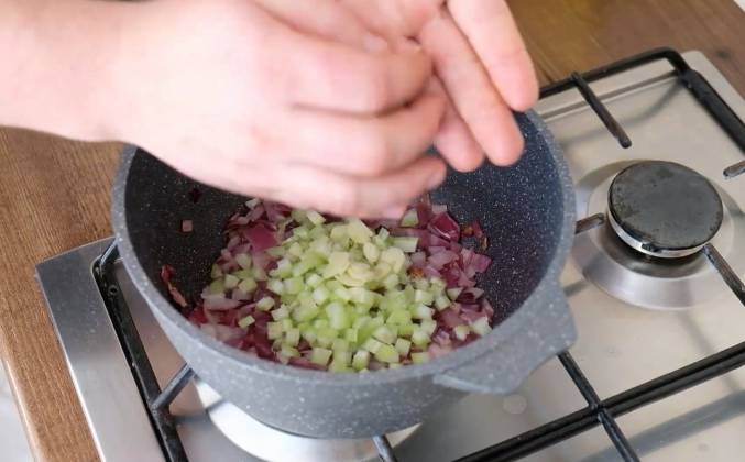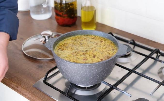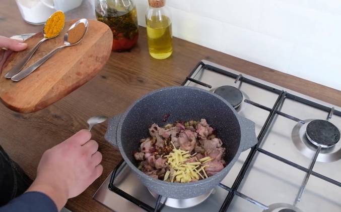 2. Добавляем специи: имбирь, хлопья острого перца, корицу и куркуму. Перемешиваем. Мясо слегка поджарилось, добавим воду. Лучше использовать горячую воду. Наш суп закипел, теперь необходимо добавить чечевицу и нут. Нут мы используем консервированный. Это хорошее решение для тех, кто экономит время и не хочет вымачивать нут несколько часов. Консервированный нут готовится несколькими способами, одним из которых - на пару, поэтому продукт сохраняет полезные свойства.