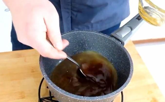 2. Духовой шкаф прогреваем заранее, до температуры 200 градусов и затем уже внутренней полностью ставим к конвекции. Чтобы основная часть жара попадала во внутреннюю полость. Запекаем при температуре 200 градусов от 1,5 до 2 часов. Приготовим соус для глазировки. Выжимаем апельсины и смешиваем с соевым соусом и медом Полученный сок мы проливаем через сито Сок мы выжили, через сито пропустили, теперь добавляем соевый соус и мед. Ставим на слабый огонь и периодически помешивая доводим до состояния сиропа. Проверяем на вкус, отлично. Теперь проверяем на консистенцию следующим образом Переливаете, стекает как вода, еще рано. Аккуратно пальцем протираете, если сироп стекает и остается полоска значит сироп готов. Вот сироп готов, смотрите мы его проливаем по ложке аккуратненько.
