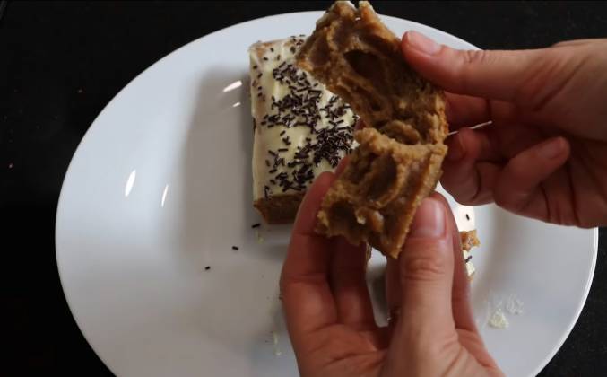 2. Муку с разрыхлителем добавляем к жидким ингредиентам и все хорошо перемешиваем. Вот такая масса у нас должна получиться. Теперь я беру форму и дно я застелила бумагой, бока смазала маслом и присыпала мукой. Выливаем в форму наше тесто и выпекаем кекс духовке разогретой до 180 градусов. Достала мой кекс из духовки. Выпекался он ровно 23 минуты. Прохожусь по краю ножом. Достаем. А сверху я покрою мой пирог глазурью из белого шоколада. Можно взять любой шоколад. Темный сюда отлично подойдет, но я люблю больше белый.