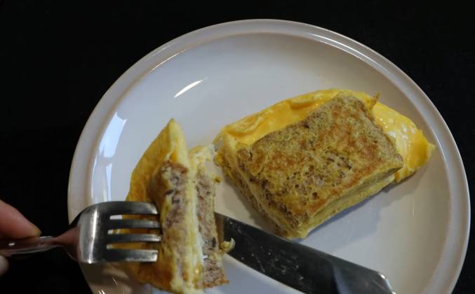 2.  Когда омлет почти готов, переворачиваю его вместе с хлебом. Оставляю на 2 минуты. А пока выкладываю сыр. Можно взять ветчину. То что вы хотите. Две половинки хлеба соединяем. Оставила еще на минуту что бы сыр расплавился.Видео рецепт ютуб ниже 👇