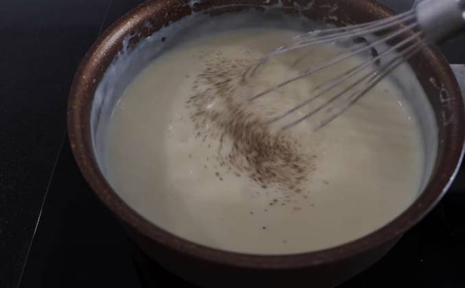 2. В общем так, как написано в книге. Прошло ровно три минуты я выключила огонь. Теперь отставляем в сторону остужаться. В отдельной посуде я нагреваю молоко. К остывшей смеси добавляем сразу все горячее молоко. Все сразу перемешиваем венчиком. Пока у меня не нагревается кастрюля. Смотрите я перемешала у нас вообще нет комков. Все однородно перемешано. Теперь я поставила кастрюлю с соусом на средний огонь, и меня эта шестерка из 10, и нужно готовить соус на среднем огне не более десяти минут постоянно помешивая. Пока готовим нужно будет поперчить, посолить, добавить мускатный орех.