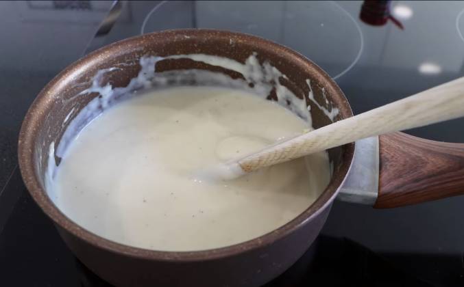 3. В книге Жоэля Робюшона не указано количество соли, ни количество перца, но по опыту я знаю, что соли бешамель берет много для того чтобы скомпенсировать сладость от молока и от сливочного масла. У меня прошло 5 минут , соус уже готов ни одного комочка. Соус считается готовым когда мы проводим по деревянной палочке и он у нас не стекает. След от ложки остается. Помимо этого хочу сказать что в книге же или рубишь он и сказано что если вы хотите убрать в холодильник ваш соус то тогда можно взять кусочек сливочного масла и вот на вилке им вот промазать буквально сверху соус. Я так никогда не делаю. Просто беру обычную пленку и плёнкой в контакт покрываю.Видео рецепт ютуб ниже 👇