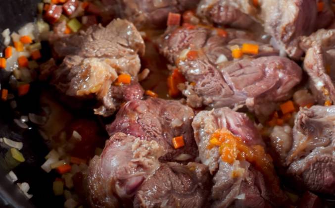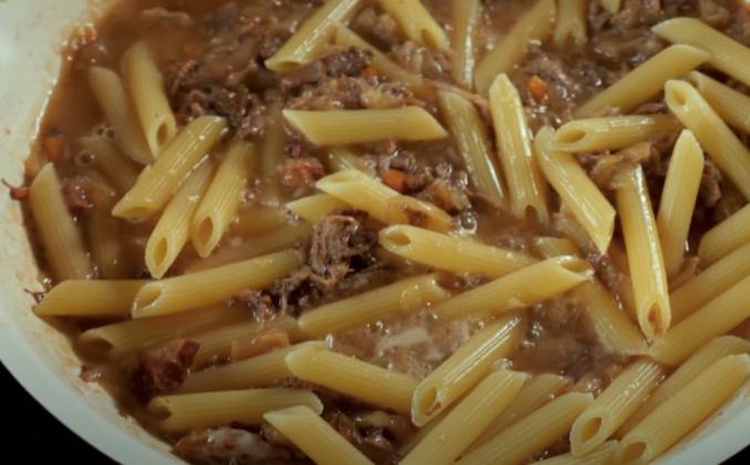 2. Перемешать, томить еще три с половиной часа отрегулировав нагрев так, чтобы содержимое чугунка слабо кипело. Вынуть из готового соуса мясо, разобрать при помощи вилок на волокна, вернуть в соус, перемешать, довести до кипения. В подсоленной воде отварить пасту до состояния альденте. В сковороду переложить 2-3 половника соуса, добавить к соусу пасту, обжаривать при помешивании до готовности пасты. Подавать приправив натертым пармезаном и черным перцем.