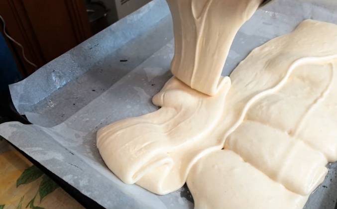 2. Всыпаем муку постепенно, чтобы не было комочков. На противень выкладываем пергамент, обязательно смазать его хорошо растительным маслом. Выливаем наше бисквитное тесто на противень. С помощью ложечки выровнять тесто по всему противню. Поставить выпекаться бисквитное тесто в духовку на 20-25 мин при 180 С. Ориентируйтесь на мощность своей духовки, бисквит довольно тонкий, поэтому выпекается очень быстро. Горячий бисквит достать из духовки, и с помощью полотенца сразу же свернуть в рулет.