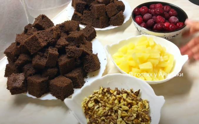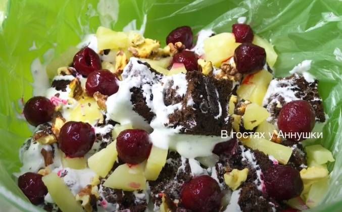 3. По желанию можно добавить ванилин для аромата. Собираю торт в круглой миске, миску заселила плёнкой. Каждый кубик бисквита опускаю в крем и выкладываю первый слой, сверху добавляю ананасы, жаренные орехи и вишню. Снова бисквит и тд. В конце хорошо все приживаю широкой лопаткой и накрываю краями пленки.