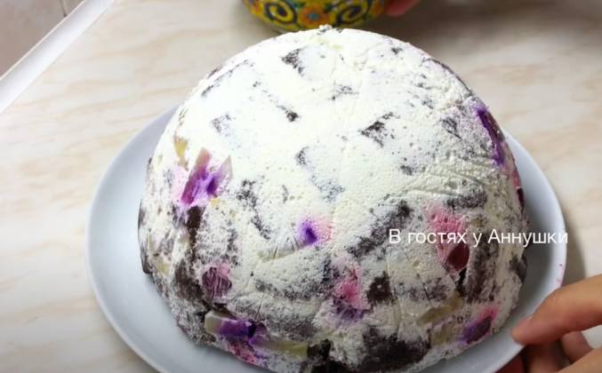 4. Убираю в холодильник на 6-8 часов. Далее миску накрываю блюдом и переворачиваю миску. Сверху можно смазать сметаной и посыпать шоколадной крошкой. Я смазала тонким слоем сметаны и украсила растопленным шоколадом. Этот торт нравится всем кто его пробует. Желаю успехов в приготовление, у Вас все получится, так как приготовление очень простое! Приятного аппетита!Видео рецепт ютуб ниже 👇