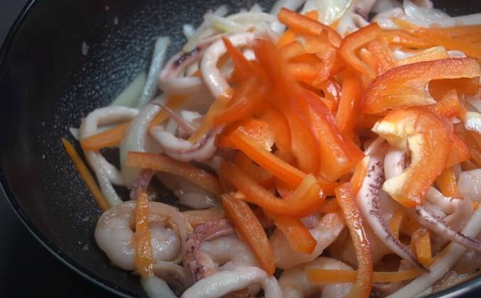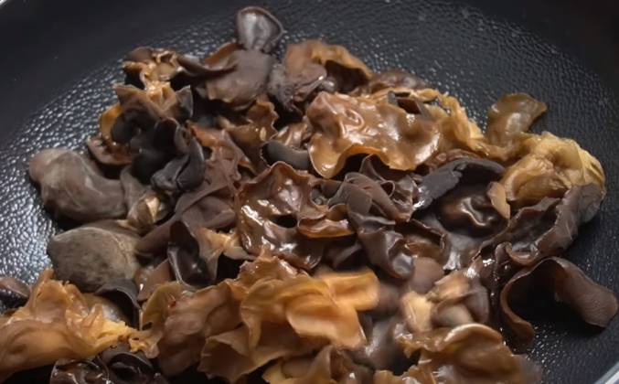 2. Грибы муэр (их еще называют китайскими грибами) заливаем горячей или теплой водой. После хорошенько промываем и отрезаем основание . Жарим на растительном масле, посолив по вкусу. Жарим морепродукты с чесноком, матсуль (кулинарное вино) и можно поперчить. Добавляем овощи, жарим 1-2 минуты и опускаем лапшу.