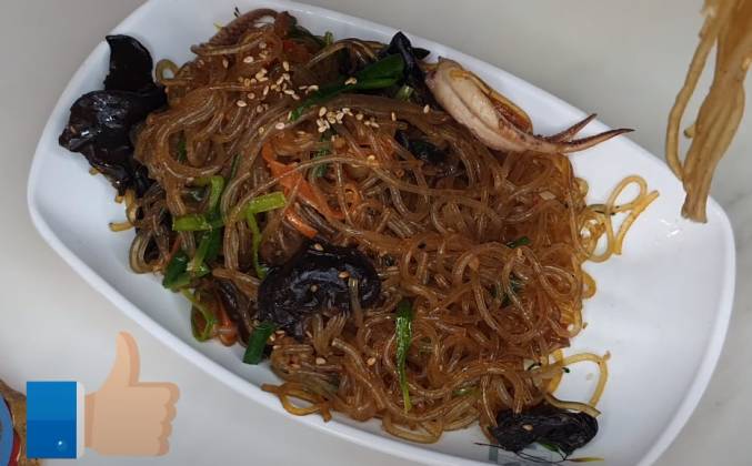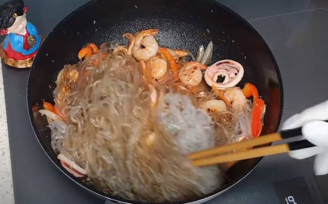 крахмальная лапша 당면, морковь 당근, древесный гриб муэр 목이버섯, джусай 부추, болгарский перец 파프리카, лук 양파, любые морепродукты (у нас кальмар 오징어 и креветки 새우), соевый соус 간장, черный перец 후추, кунжутное масло 참기름