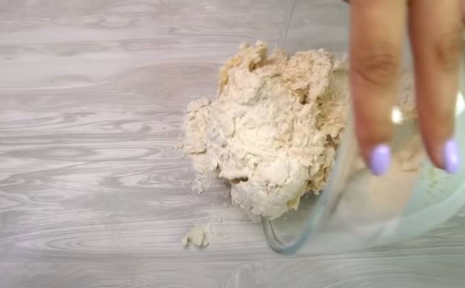 2. Отмерим 250 грамм муки, добавим 1 ч.л. разрыхлителя и перемешаем. Добавляем муку с разрыхлителем и замешиваем тесто, Возможно понадобится еще муки, все зависит от густоты кефира и размера яйца.
