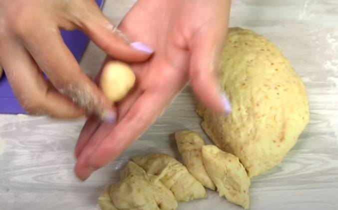 3. Но главное не переборщить, тесто должно быть мягким, в конце замеса добавляем 1 ст.л. растительного масла, еще раз вымешиваем и теперь тесто делим на части, каждая часть примерно весом по 10 грамм, катаем колобочки.