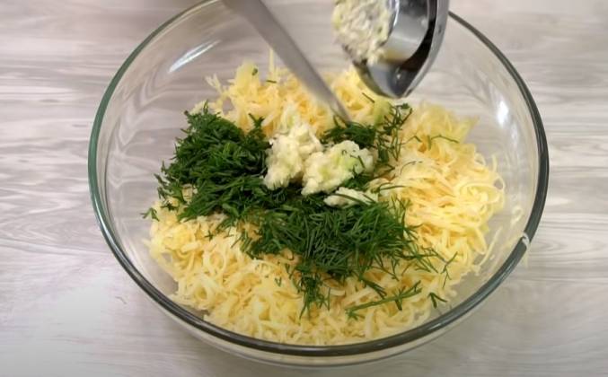 3. Берем один колбочек раскатываем овал, и закатываем его в рулетик, края защипываем. Теперь ножом делаем надрез но не до конца, получается вот такие лодочки. Кладем их на противень застеленный бумагой для выпечки. Сыр натрем на мелкой терке у меня 150 грамм, Вы можете взять по вкусу, укроп мелко порубим и добавим к сыру, сюда же добавляем 2-3 зубчика чеснока.