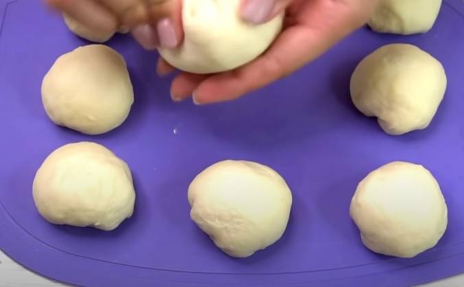 2. Вливаем в миску подошедшие дрожжи, соль 1/ч.л. и вливаем. растительное масло 40 мл. Теперь добавляем просеянную муку 300 грамм и замешиваем тесто руками или можно воспользоваться тестомесом. Тесто должно получится мягким эластичным, к рукам не липнет. Убираем в теплое место для подъема на 1-1,5 часа, Теперь, когда тесто поднялось тесто обминаем и делим его на части я делю на 9 частей весом по 60 грамм.