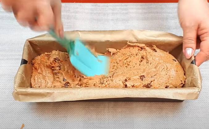 3. Перекладываем тесто в форму объемом не менее 1 л., застеленную пергаментной бумагой и равномерно его распределяем. Отправляем форму с тестом в заранее разогретую духовку и выпекаем 50-60 минут, я выпекала на режиме конвекция при температуре 160°C (320°F), если вы выпекаете на обычном режиме верх+низ установите духовку на 180°C (356°F). Кекс готов, достаем его из духовки. Даем ему постоять минут 5 в форме, а затем извлечем из нее, чтобы он полностью остыл.