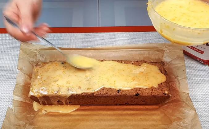 5. Извлекаем кекс из формы и оставляем его на столе до полного остывания, а, чтобы ускорить этот процесс можете убрать его в холодильник. На полностью остывший кекс наносим сахарно-апельсиновую помадку со всех сторон. После этого убираем кекс в холодильник хотя бы на 20-30 минут до полного застывания глазури.