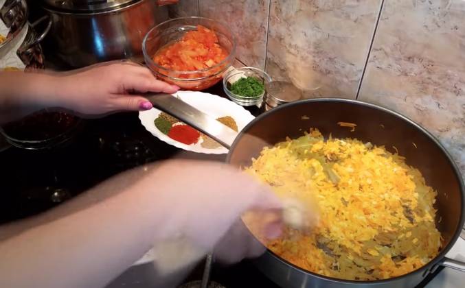 2. Все продукты подготовлены, и мы переходим к плите для приготовления супа. Я буду готовить этот суп в широком и глубоком сотейнике. Наливаем в него растительное масло, и как только масло хорошо нагреется, высыпаем лук. Обжариваем лучок до полуготовности и затем добавляем морковь, продолжаем обжаривать овощи до слегка золотистого цвета. Затем всыпаем чеснок, хорошо перемешиваем и тушим еще 1-2 минуты. Как только почувствуете чесночный аромат – добавляйте томатное пюре.