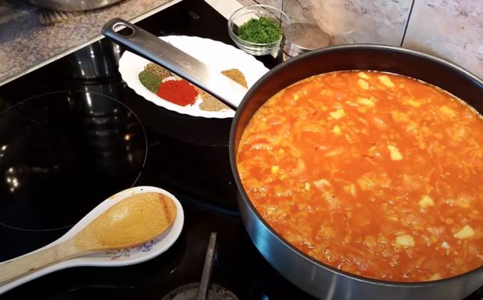 4. Спустя 10 минут добавляем специи: Лавровый листик, по пол чайной ложки копченой паприки, хмели-сунели, черного молотого перца, сванской соли, полную чайную ложку сладкой паприки и по пол чайной ложечки сушёного базилика, кинзы и прованских трав. Супчик хорошо перемешайте и попробуйте на вкус, мне не хватило соли и немного сахара. Накрываем крышкой и продолжаем варить на медленном огне еще 5-7 минут.