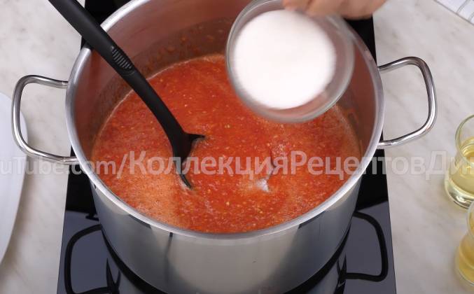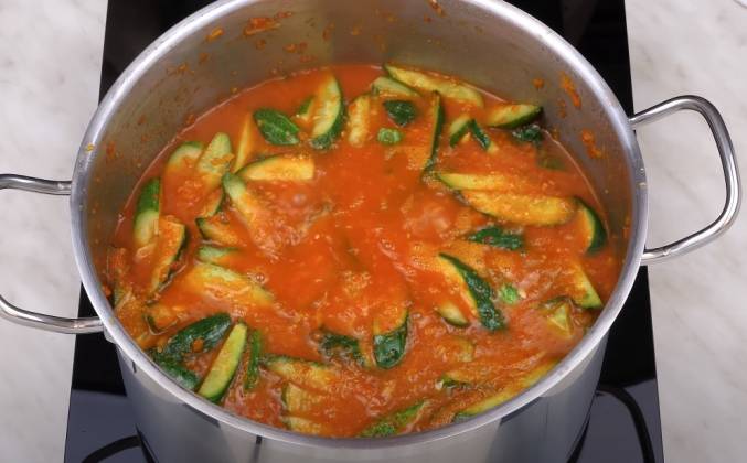 2. Все смешиваем, доводим массу до кипения и, периодически мешая, чтобы овощи не осели на дно кастрюли, кипятим 15 минут. Через 15 минут добавляем 3-4 зубчика чеснока, измельченного любым способом - я натерла на терке, и всыпаем нарезанные огурцы. Все как следует перемешиваем и на максимальном огне доводим до кипения. Эта заготовка не подвергается стерилизации, тут главное, не переварить огурцы, тогда они останутся плотными и хрустящими.