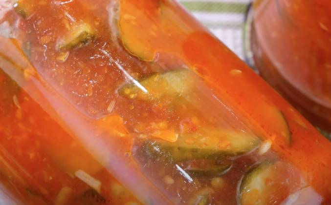 4. Убавляем нагрев на минимальный, чтобы только поддерживать кипение, раскладываем готовый салат в банки, герметично закатываем, переворачиваем на крышки и укутываем до утра. Старайтесь положить в банки побольше огурцов, а уже пустоты залить томатной заливкой. Из этого количества овощей получается чуть больше 3,5 литров отменного лечо из огурцов, которое прекрасно хранится в условиях комнатной температуры.