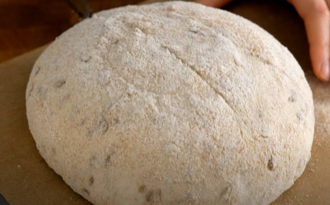2. Смочите руки в воде и сделайте 1-е складывание теста. И снова прикройте тесто полотенцем и оставьте на расстойку при комнатной температуре на 20 минут. Смочите руки в воде и сделайте 2-е складывание теста. И снова прикройте тесто полотенцем и оставьте на расстойку при комнатной температуре на 60 минут. Пока тесто расстаивается возьмите миску для расстойки или уложите полотенце в миску и присыпьте ржаной сеяной мукой. Выложите тесто на хорошо припыленный мукой стол обомните его в колобок и уложите в миску для расстойки швом вверх.
