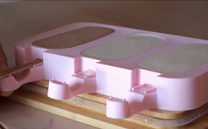 2. Хорошо взбиваем всё вместе 1-2, пока миндаль не растворится. Основа готова. Теперь нужно перелить её в форму - я использовала силиконовую форму, из неё будет очень легко вытащить мороженое. Если вам больше нравится шоколадное или кофейное мороженое, то в основу, по вкусу, можно добавить какао порошок или долить немного крепко заваренного кофе. Также перемешиваем и переливаем в форму. Вставляем палочки и отправляем морозилку до полного застывания на несколько часов, желательно на ночь. Когда мороженое затвердело, вытаскиваем его из формы. Его можно есть уже сейчас, если вы не хотите покрывать его шоколадом.