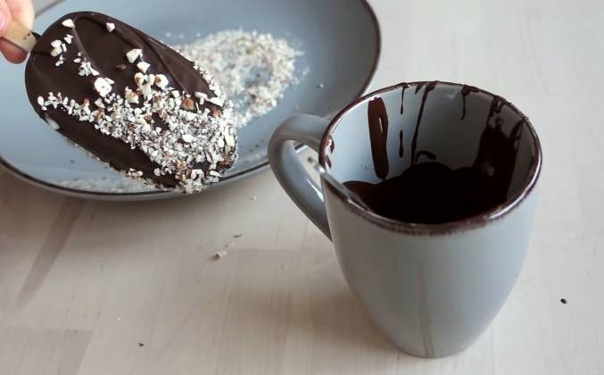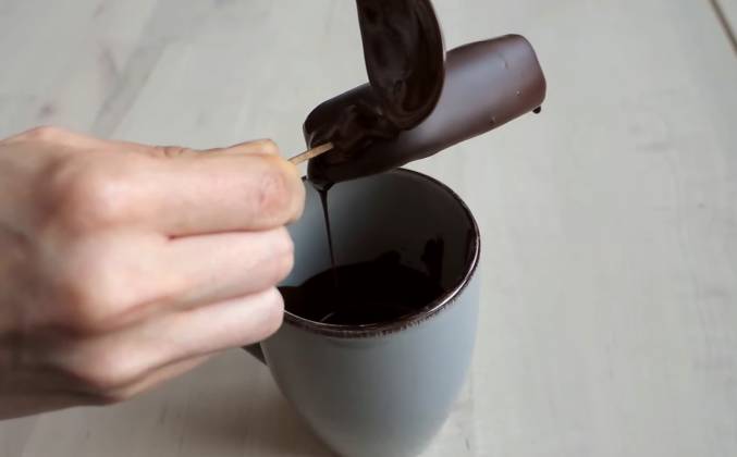 4. Шоколад также можно растопить в микроволновке - для этого нужно этапами нагревать его по 15 секунд, затем перемешивать, затем снова нагревать 15 секунд и снова перемешивать, пока он не станет жидким. Для большего удобства я перелила шоколад в кружку, в которую удобно окунать мороженое и подождала пока он остынет. Шоколад должен быть слегка тёплым, не горячим, так как при контакте горячего шоколада с мороженым, оно сразу же начнёт таять. Окунаем мороженое в жидкий шоколад и сразу же вытаскиваем давая стечь лишнему шоколаду. Шоколад практически сразу застывает на холодном мороженом.