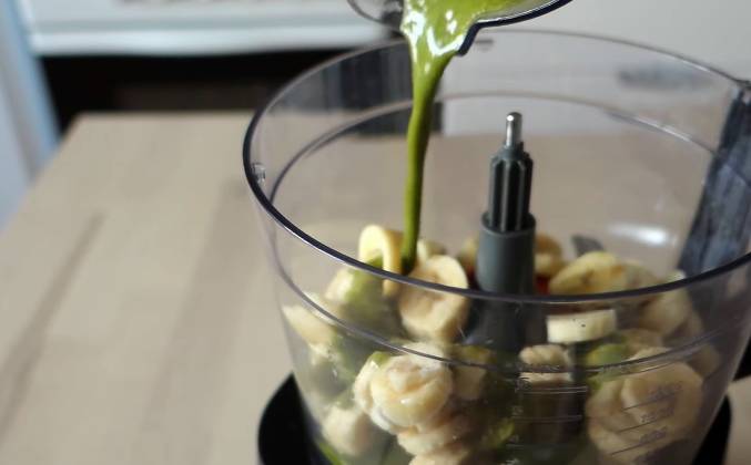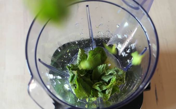 2. К соку добавляем цедру и листья мяты. Снимаем их со стеблей, отправляем блендер - для жидкостей я обычно использую такой высокий блендер - и взбиваем до состояния жидкого пюре. Затем переливаем это пюре к бананам и измельчаем.