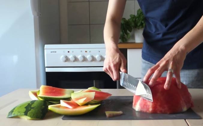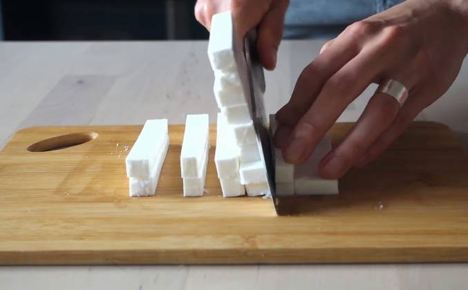 2. Пропорции ингредиентов указаны приблизительно, вы можете сами варьировать их на свой вкус. Далее нам понадобится веганский сыр фета - он солёный и имеет нежную консистенцию, что отлично подойдёт к сочному сладкому арбузу. Сливаем жидкость из упаковки, нарезаем его кубиками и отправляем в миску.