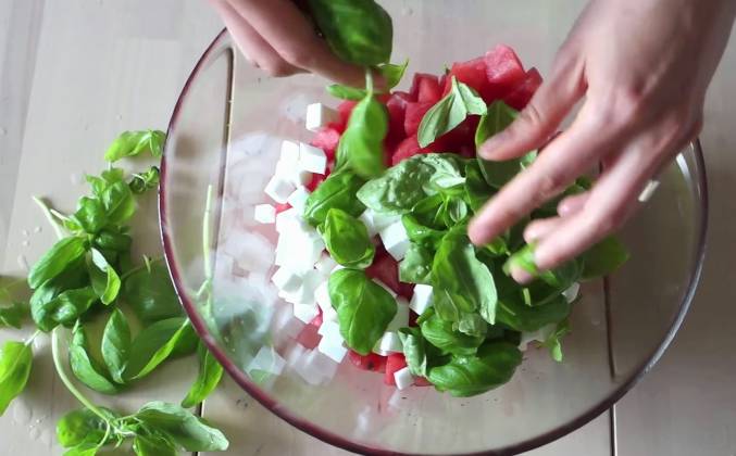 3. И третий ингредиент - свежий базилик, именно свежий, сушёный тут не подойдёт. Пряный базилик идеально дополнит сладко-солёную композицию. Срываем листики со стеблей и отправляем в салат. Теперь осталось всё перемешать аккуратно, чтобы не помять арбуз и сыр. Я этот салат ничем не заправляю, он и так получается очень сочный и вкусный. Такой салат отлично утолит и жажду, и голод жарким летним днём!Видео рецепт ютуб ниже 👇