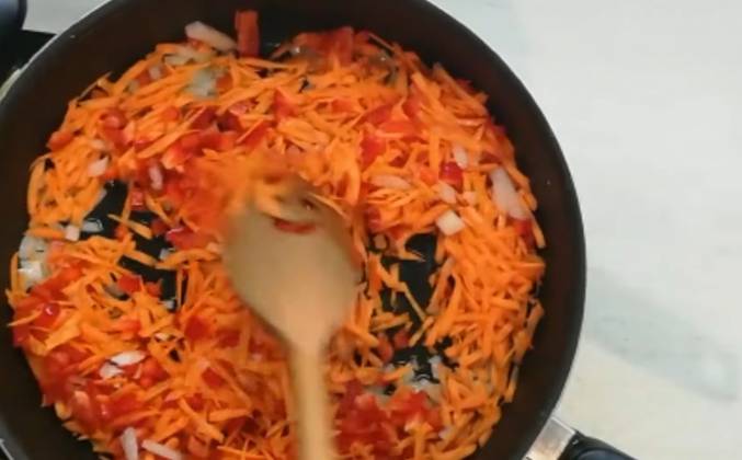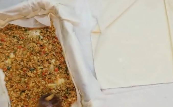 2. Смажьте сковороду растительным маслом. Ставим ряд листов теста. Смажьте каждый лист теста кисточкой с растительным маслом. Добавьте треть мясного состава. Снова кладем смазанные растительным маслом листы теста. Добавляем еще один слой мяса.