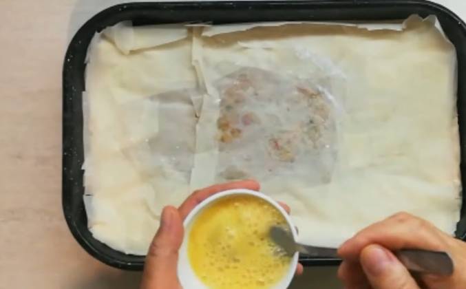 3. Снова кладем несколько листов пирога. Добавьте последний слой мяса. Сверху выложить последние листы теста для пирога. Соберите бока и сложите их сверху. Кладем последние листы теста. Смешайте отдельное яйцо. Сверху смазать пирог. Перед выпечкой пирог нарезаем ломтиками. Поставить в духовку на 30 минут при 180 градусах Цельсия. Мясной пирог.Видео рецепт ютуб ниже 👇