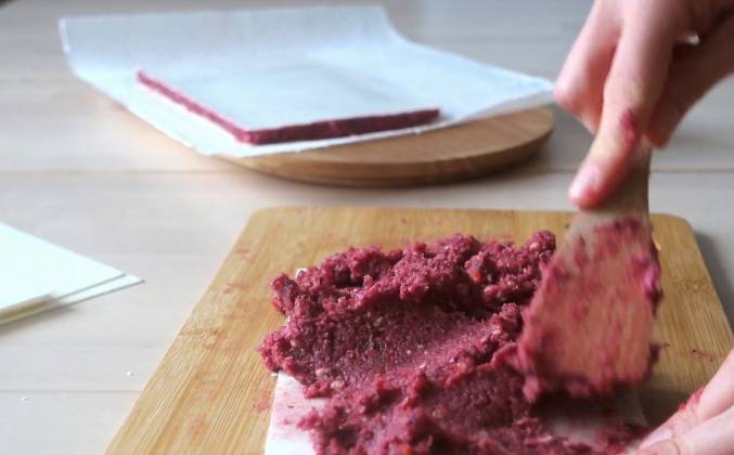 2. Следом добавляем сухофрукты, предварительно слив с них воду, и всё тщательно измельчаем. Пару раз я останавливала блендер и снимала со стенок разлетевшуюся начинку. Теперь нужно выложить начинку на облатки - я использовала 4 листа размером 12х20 см. Выкладываем начинку на первый лист и равномерно распределяем её. Если у вас облатки такого же размера, то смело выкладывайте сразу половину начинки. Для этого вы можете воспользоваться лопаткой, либо сделать это руками. Накрываем вторым листиком и подравниваем края.