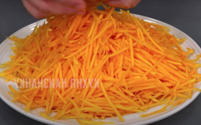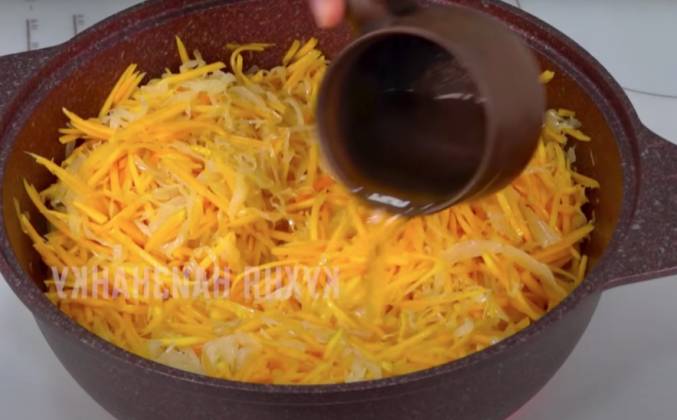 2. Добавляю к капусте немного воды, накрываю крышкой и тушу примерно 15 минут. А теперь тыква. Натираю ее на крупной терке. Я сегодня взяла терку для моркови по-корейски. Тыквы всегда беру в два раза больше, чем капусты. Поверьте, много не будет! И сладко не будет! Именно то, что нужно!