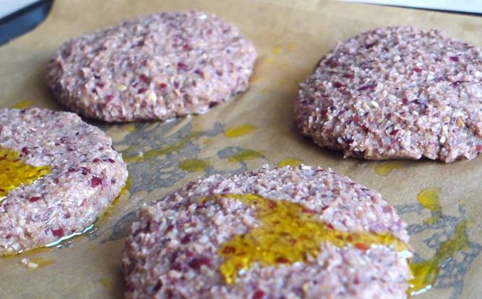 2. Добавляем соль, чёрный перец и молотый мускатный орех. Всё хорошенько измельчаем до кашеобразного состояния. Эти котлеты можно будет пожарить, но я предлагаю вам более здоровый вариант - их запечь. Для этого подготавливаем противень, выкладываем на него пергамент и смазываем растительным маслом. Теперь нужно разделить фарш на 4 части и сформировать из них котлетки. Выкладываем котлетки на противень, хорошенько смазываем растительным маслом - у меня оливковое - и отправляем в духовку. Если во время выпекания котлетки немного потеряют свою форму, просто подровняйте края лопаткой, чтобы придать им прежний вид. Выпекаем 25 минут при температуре 170° на режиме конвекции. Пока котлеты выпекаются, подготовим соус для бургера - в нашем случае это будет соус сальса.