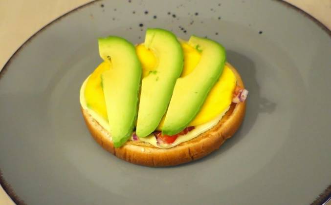3. Для этого нужно порезать помидор на очень мелкие кубики. Режьте настолько мелко, насколько сможете. Точно так же поступаем с луком. Добавляем сок половинки лимона, чёрный перец, перец чили и соль. Теперь нам нужно очистить манго и тонко его нарезать. Авокадо нужно также избавить от кожуры, косточки, и тонко нарезать. Для заправки к бургеру смешайте растительный йогурт, горчицу и соль. Когда котлетки будут готовы, по желанию, можете положить на них по ломтику сыра и оставить ещё на пару минут в выключенной духовке, чтобы сыр расплавился.
