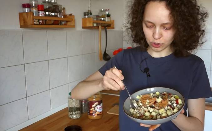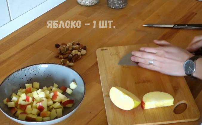 3. Вы также можете добавлять семена, которые нравятся именно вам. Ну и гость нашей программы - это арахисовая паста: источник белка и энергии. Кстати, сколько тут белка? 21 грамм. И добавляем одну ложку арахисовой пасты. И так, совет, как есть это блюдо: цепляем немножечко яблочек, немножечко орешков, арахисовую пасту - идеально! Видео рецепт ютуб ниже 👇