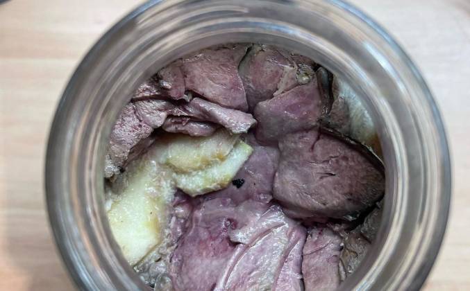 2. Сверху положить кусочек сливочного масла (20г). Плотно закрыть горлышко банки тройным слоем фольги, закрепить резинкой. Запекать в течение 30 мин. Затем духовку выключить, приоткрыть дверцу и оставить в таком виде еще на 10-15 мин. Аккуратно слить образовавшийся сок (он в паштет не идет!), сложить содержимое банки в блендер.