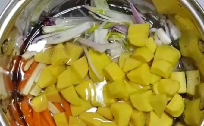 2. Выложите овощи в большую кастрюлю. Добавляем воду. Травяные специи. 1 болгарский перец. Положите в кастрюлю.