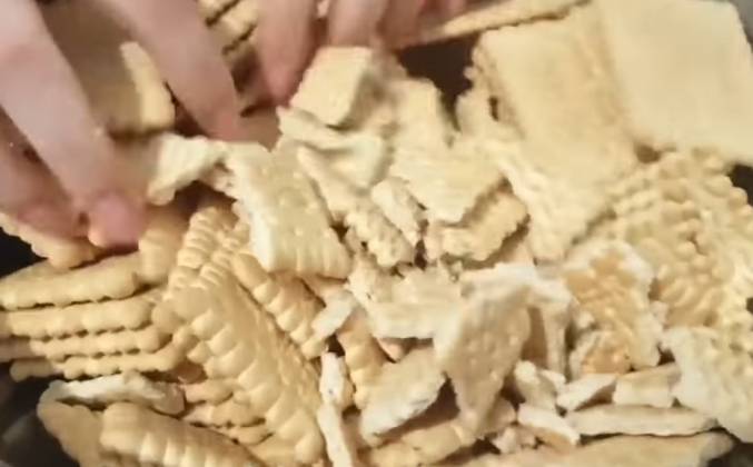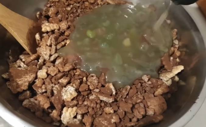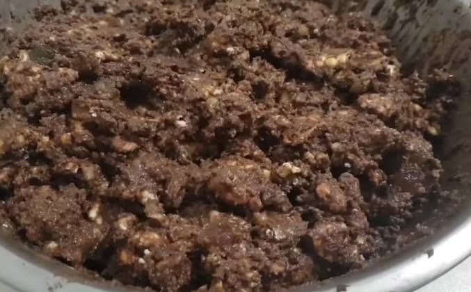 2. 450 грамм печенья (2 упаковки). Измельчаем печенье вручную. Добавьте 3 столовые ложки какао поверх печенья. Хорошо перемешать. Turnam рахат-лукум топить. 1 пакетик сливочного масла. 3 столовые ложки сахара. 200 граммов ядер грецких орехов.